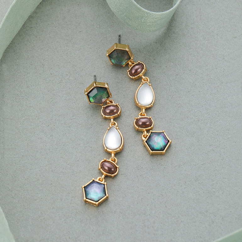 Side view of the long drop earring, highlighting the multi-stone design with opalite and acrylic accents.