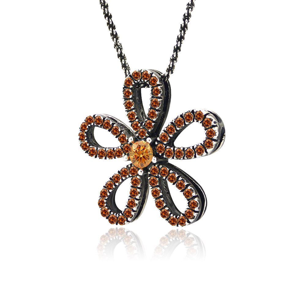 - A close-up shot of the orange gemstone flower pendant, highlighting the crystal details.