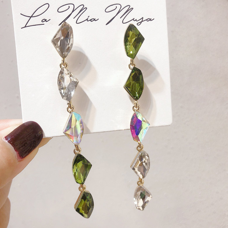Close-up view of the long rhinestone dangle drop earrings with clear and green gemstones on a display card.