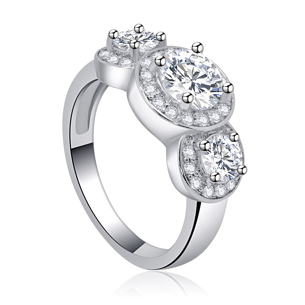 The design features three dazzling round-cut cubic zirconia stones, with the central stone representing the present, flanked by two stones symbolizing the past and the future. The rhodium-plated brass band is further enhanced with a delicate pavé of smaller zirconia, adding a brilliant sparkle that catches the light from every angle.