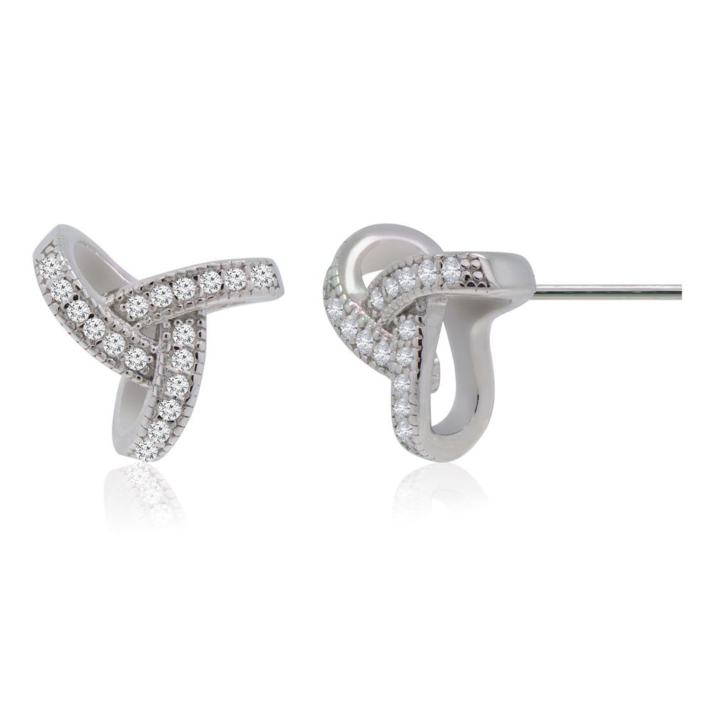 Front and back view of the Love Knot Me earrings, showing the post closure and detailed cubic zirconia setting.