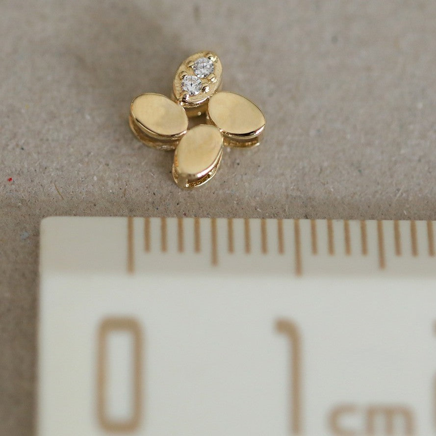 - Close-up view of the four-leaf flower pendant, highlighting the brilliant cubic zirconia stone and polished 14K gold finish.