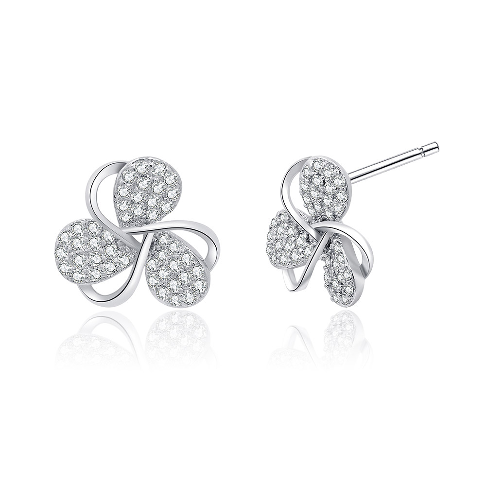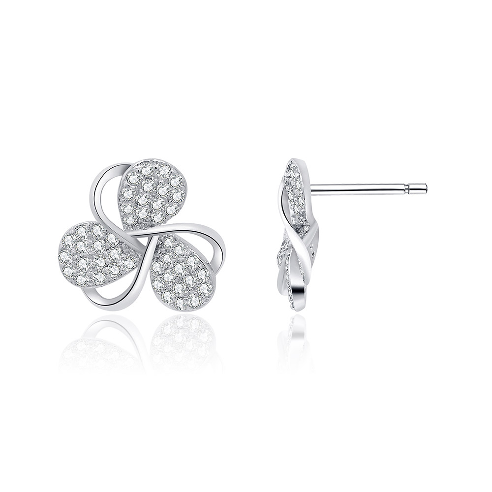 - Front and back view of the silver four-leaf clover earrings, displaying the sparkling cubic zirconia and the post closure.