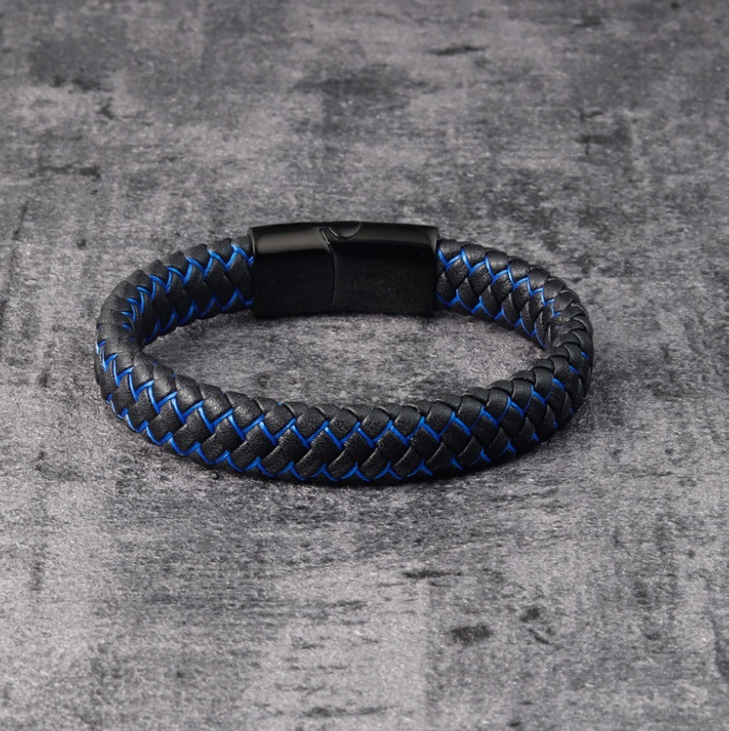 Stylish braided leather bracelet for men with a striking blue accent cord and a sleek black clasp.