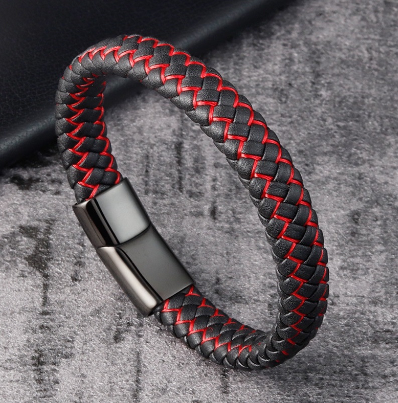 Men's leather wrap bracelet with contrasting red stitching, showcasing its woven design and metal clasp.