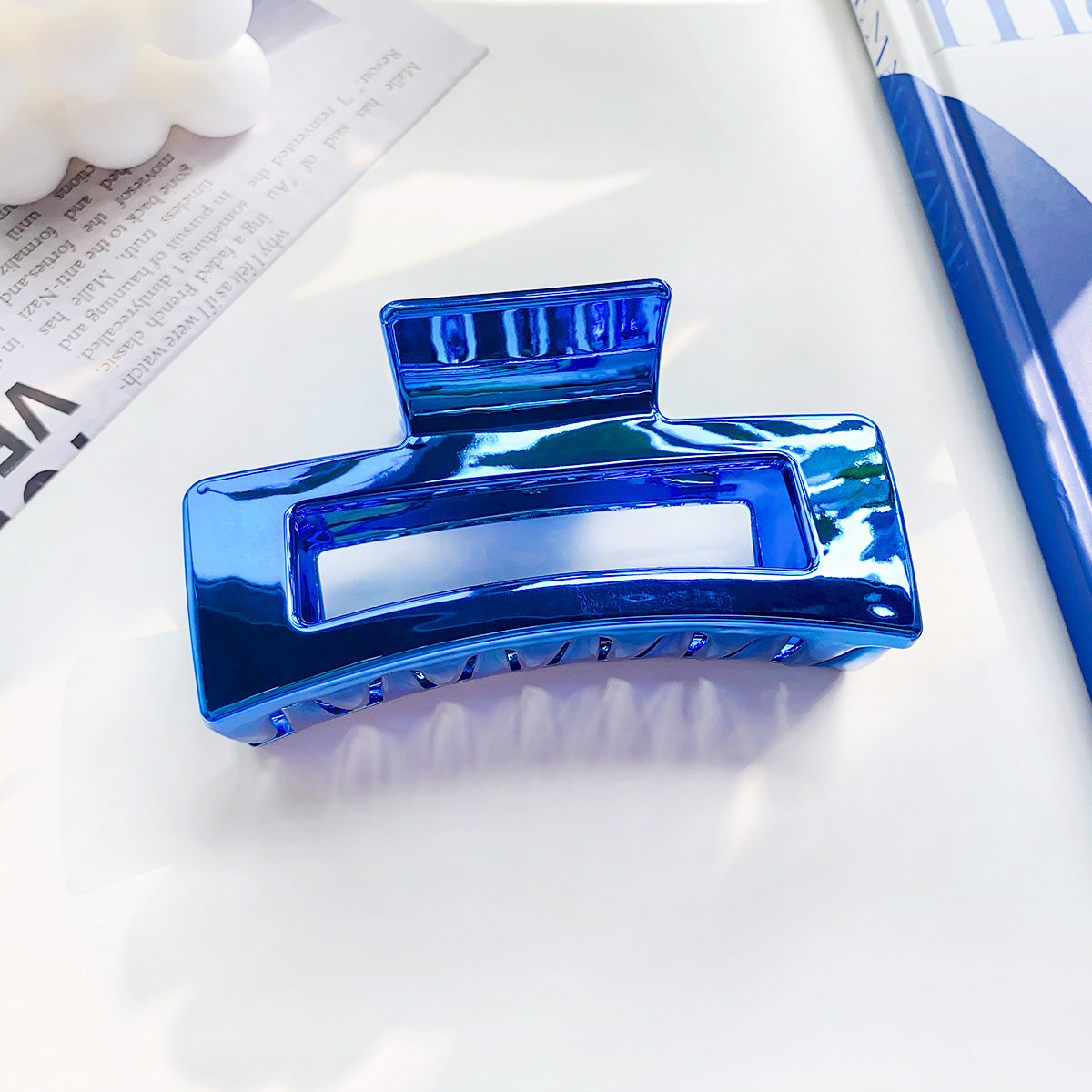 Close-up of the blue hollow square metal hair clip.