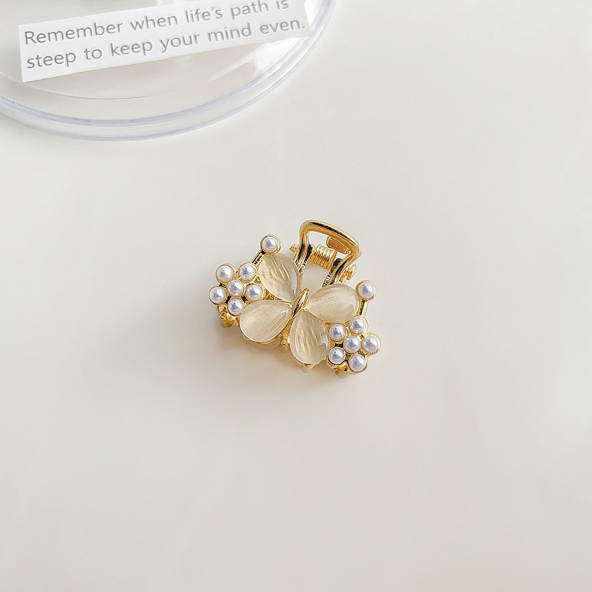 Detailed view of a butterfly-shaped mini hair claw clip adorned with lustrous pearls and a central stone.