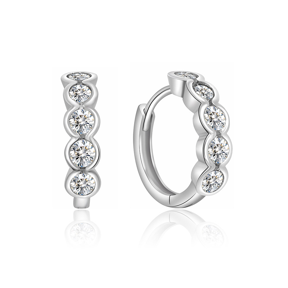 Detailed close-up view of the rhodium-plated mini huggie earrings, highlighting the brilliant sparkle of the cubic zirconia.