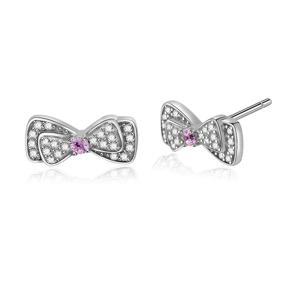 - Detailed top-down view of the silver bow stud earrings, showcasing the intricate setting of the clear and pink cubic zirconia stones.