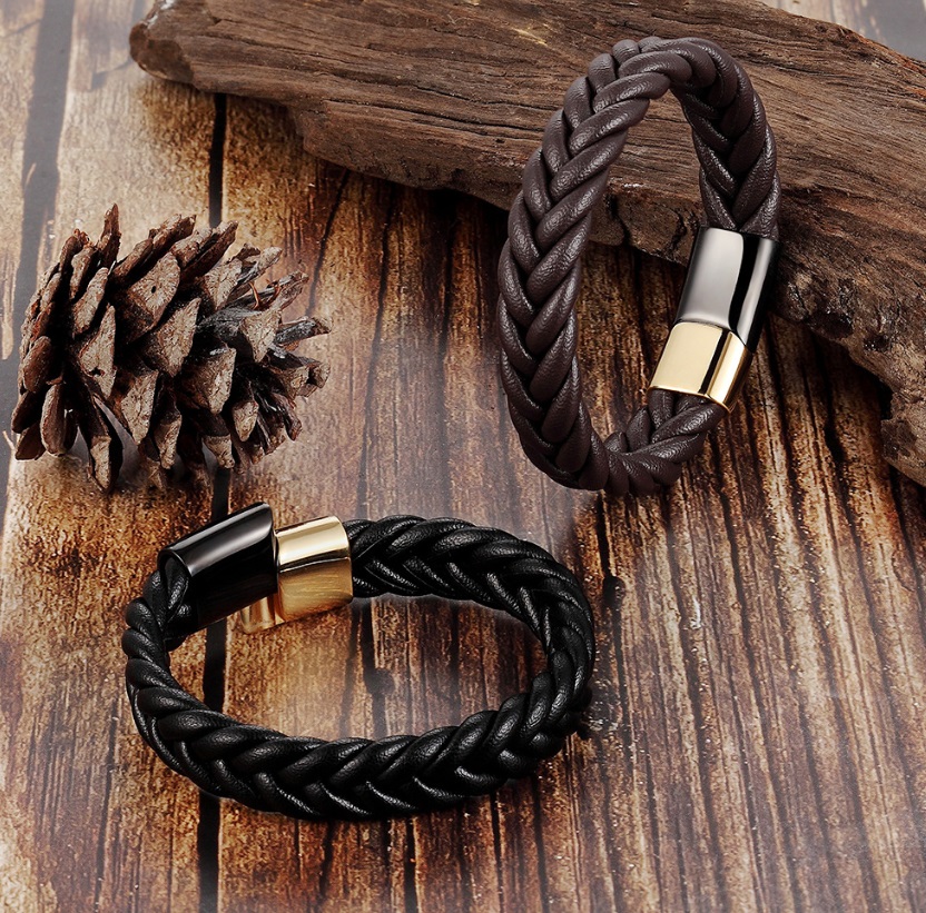 Two braided leather bracelets, one in black and one in dark brown, displayed together to show the available styles.