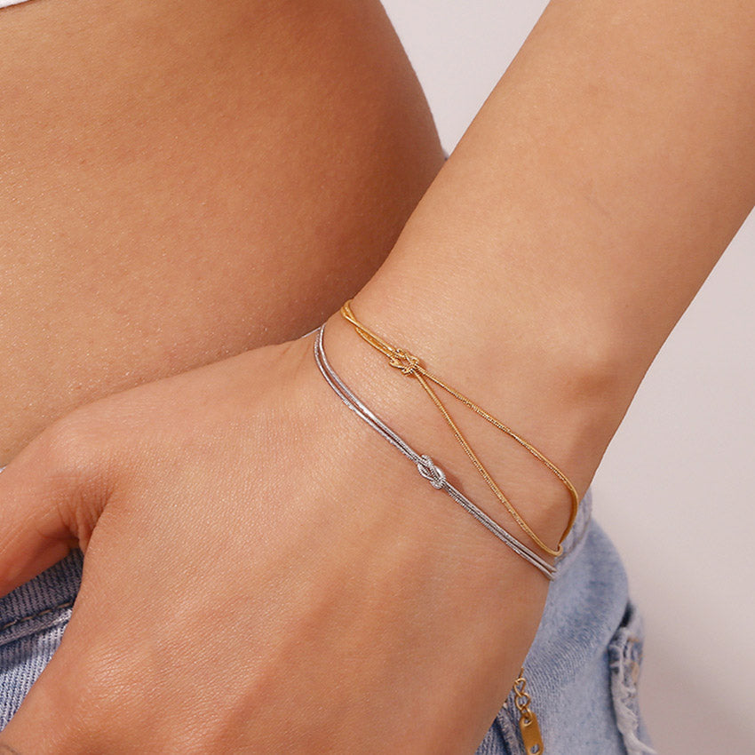 The minimalistic knot bracelets displayed in both 18K gold-plated and silver-plated finishes.
