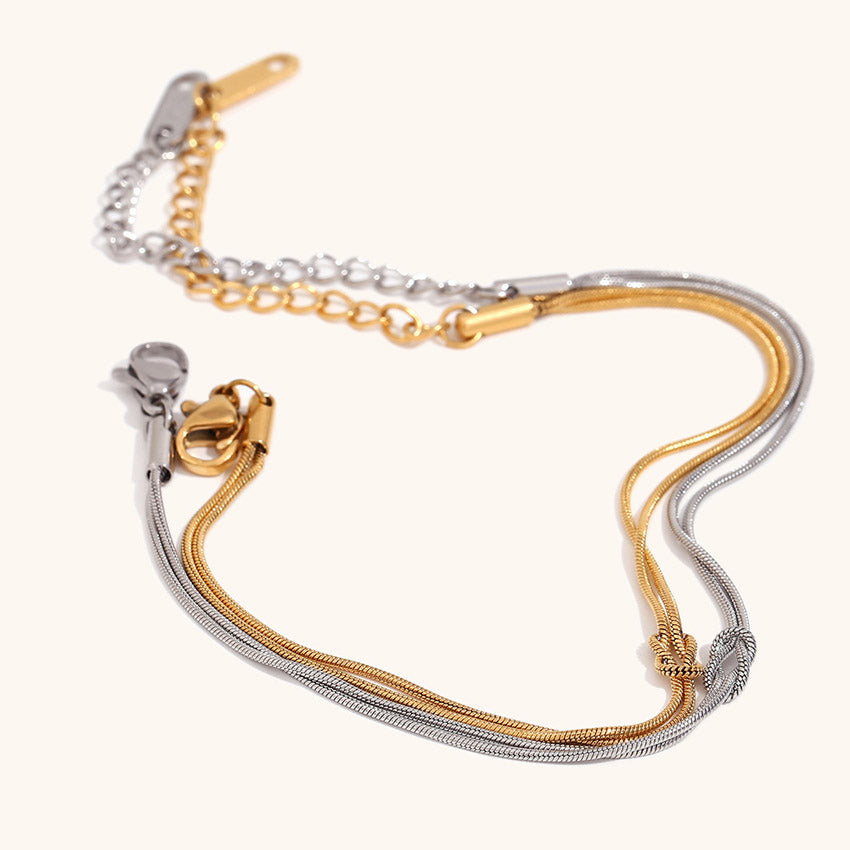 Close-up of the double-layered gold snake chain knot bracelet on a wrist, showcasing its elegant design.