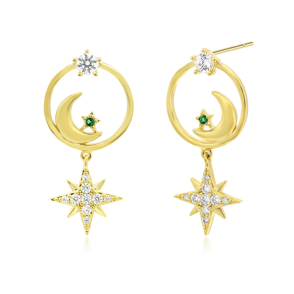 - A detailed view of the Moon Star Drop Statement Earrings, showcasing the green and white gemstones on the gold-plated brass.