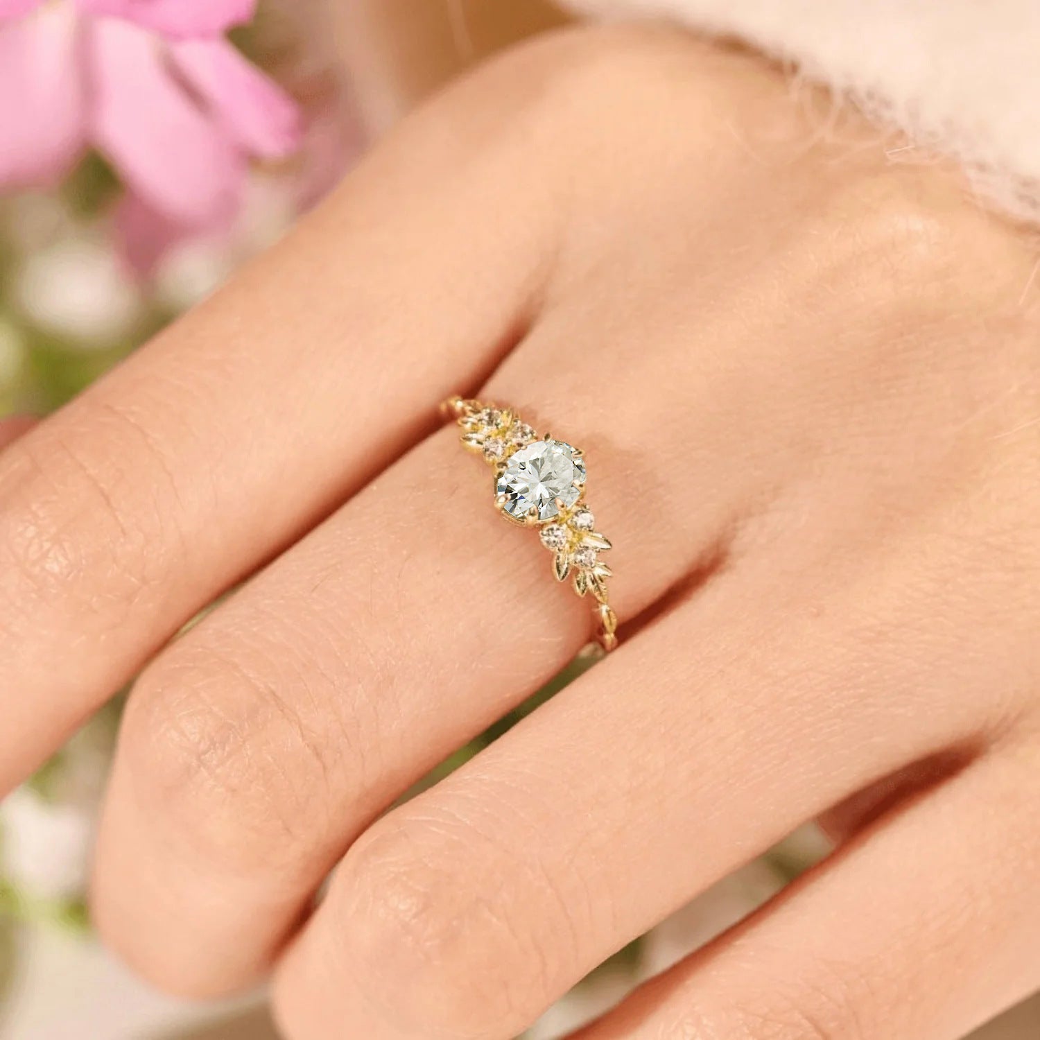 The fusion of leaf motifs and the central stone reflects outstanding jewelry-making artistry. This ring is designed to be a miniature garden encircling your finger, perfect for adding a touch of refinement to any look.