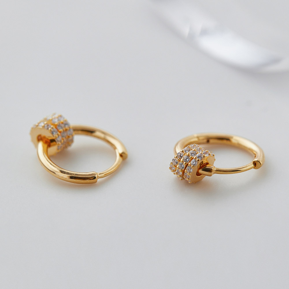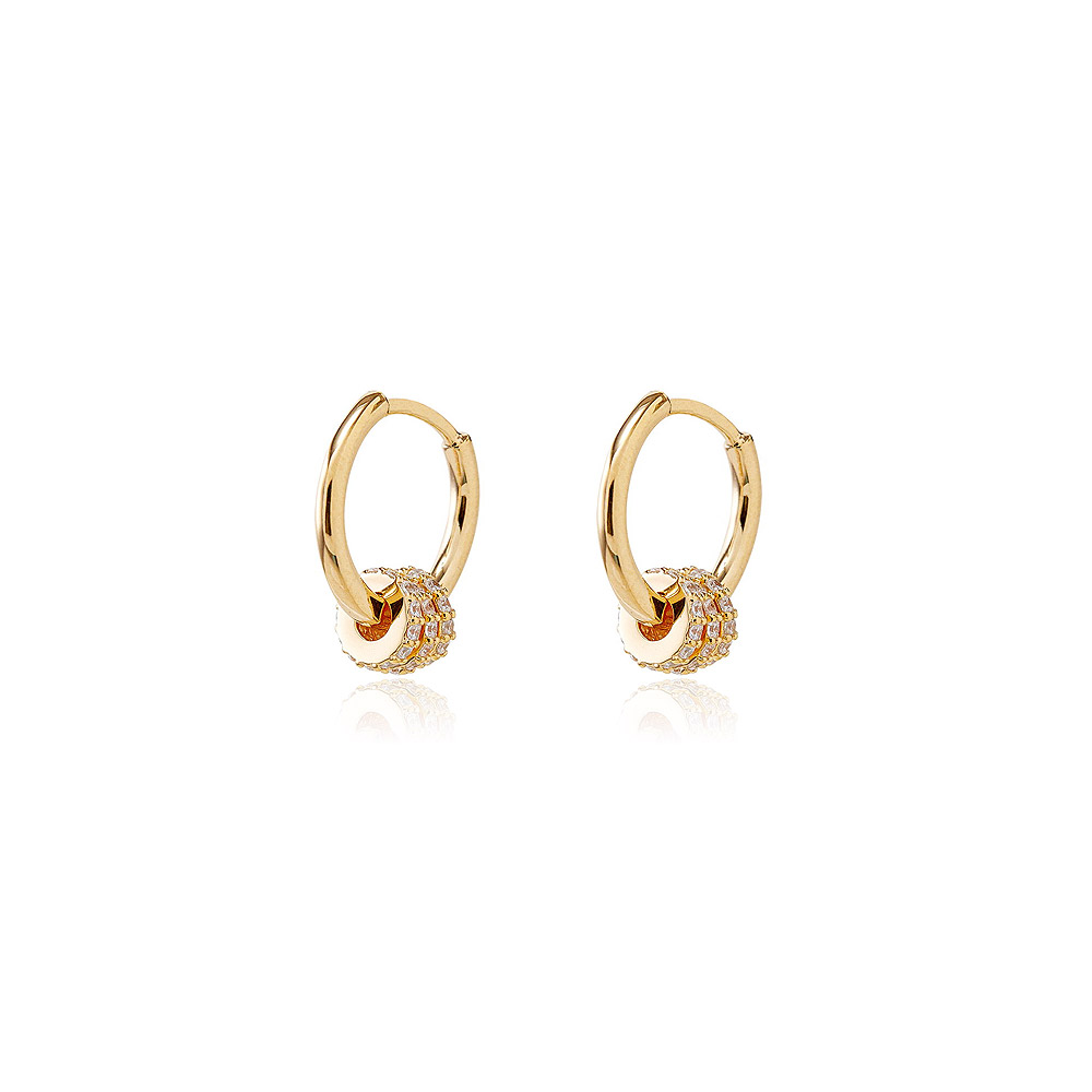 Detailed view of the gold hoop earrings showcasing the clear cubic zirconia gemstones.