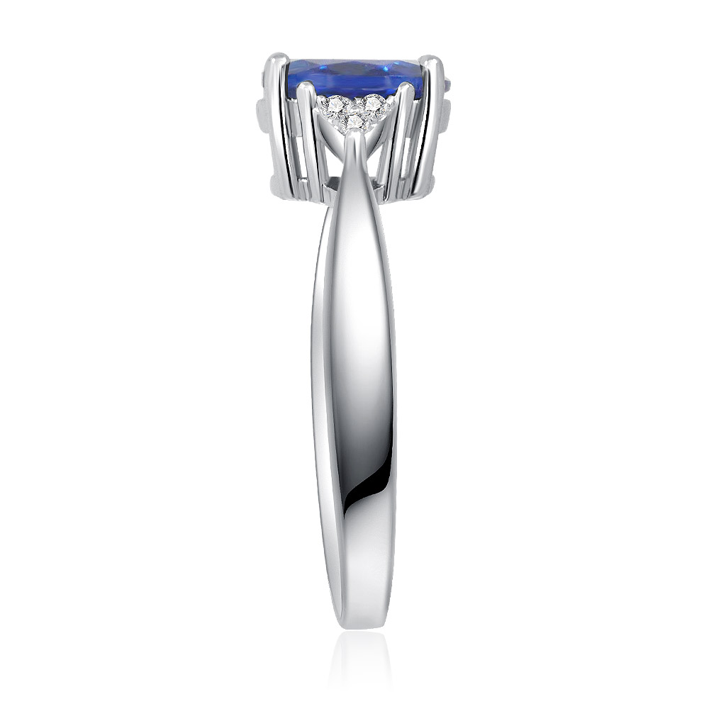 - Side view of the Oval Sapphire and Zirconia Ring, showcasing the prominent blue gemstone and rhodium-plated band.
