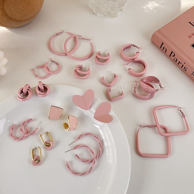 Assortment of pink enamel earrings showcasing different designs and styles.