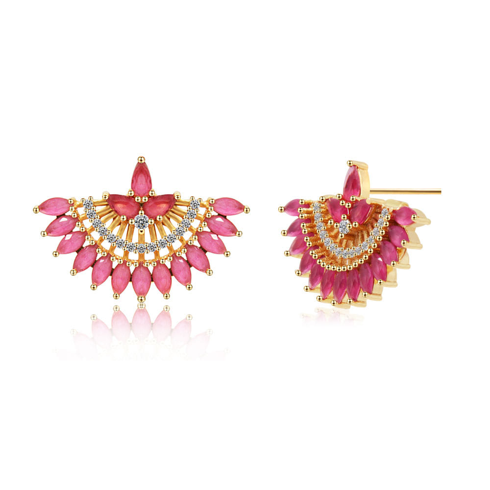 Detailed view of the Pinky Fan Studs showcasing the intricate gold work, pink gemstones, and sparkling white diamonds.