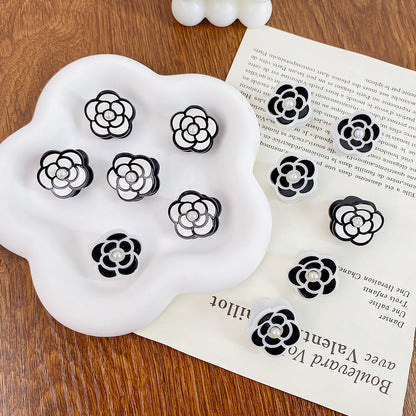- An assortment of black and white camellia flower hair clips displayed together.
