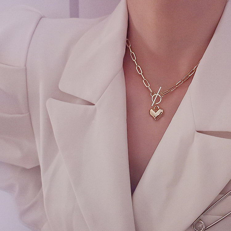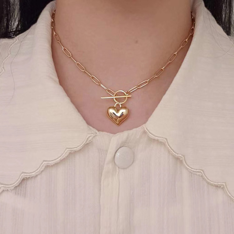 Close-up view of the toggle clasp and heart pendant on the gold necklace.
