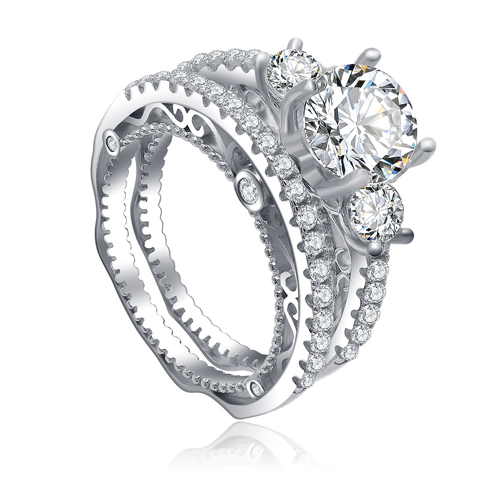 Close-up view of the luxurious silver bridal ring highlighting the large central cubic zirconia.