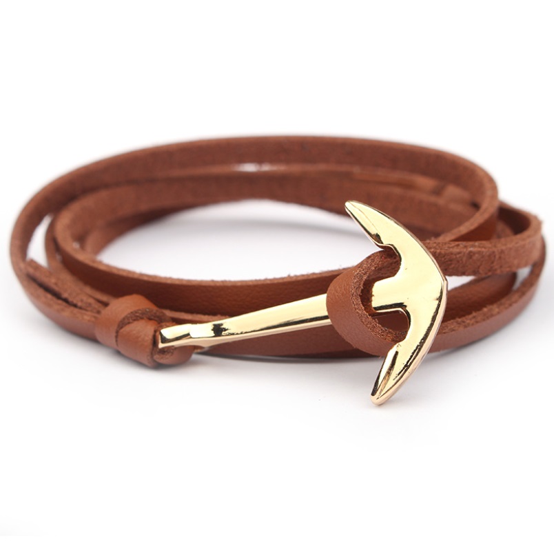 Brown PU leather bracelet with a unique gold axe-shaped clasp.