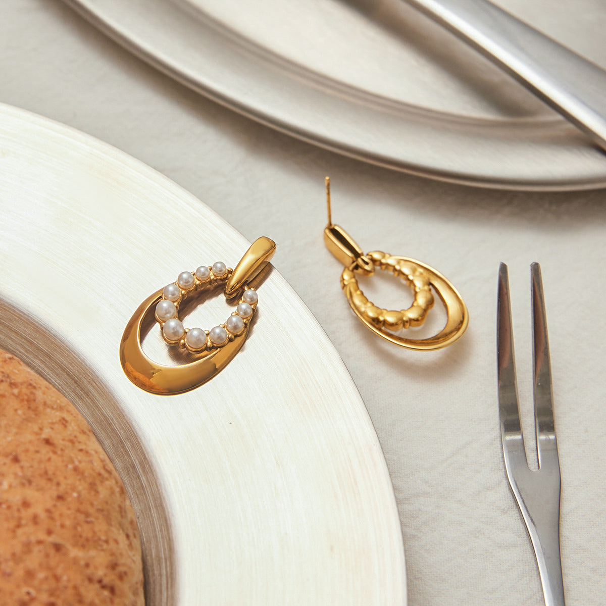 Set of PVD gold-plated pearl earrings displayed on a decorative plate, highlighting their lustrous finish.