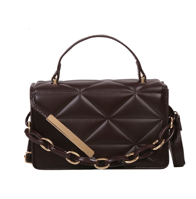 - Detailed view of the dark brown quilted PU leather handbag with a chain-link strap.