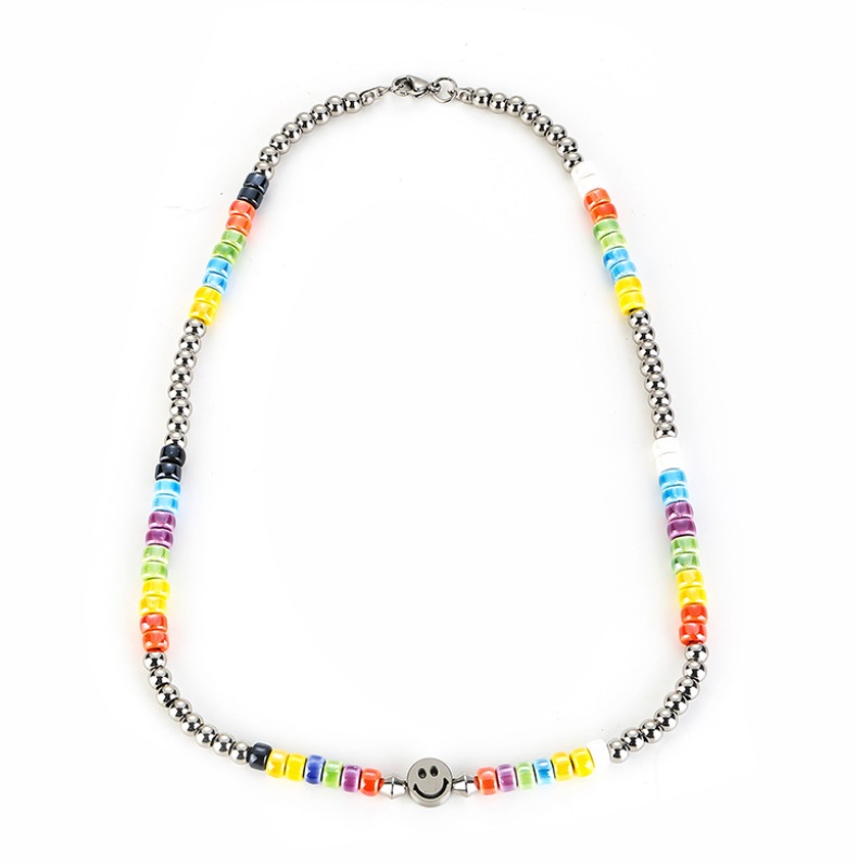 Detailed view of the stainless steel necklace featuring rainbow beads and a central smiley face charm, showcasing the quality craftsmanship.