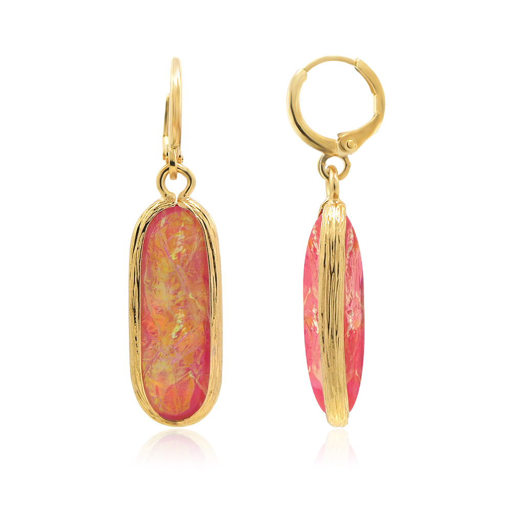 A pair of Rainbow Resin Earrings showcasing their vibrant pink and orange hues.