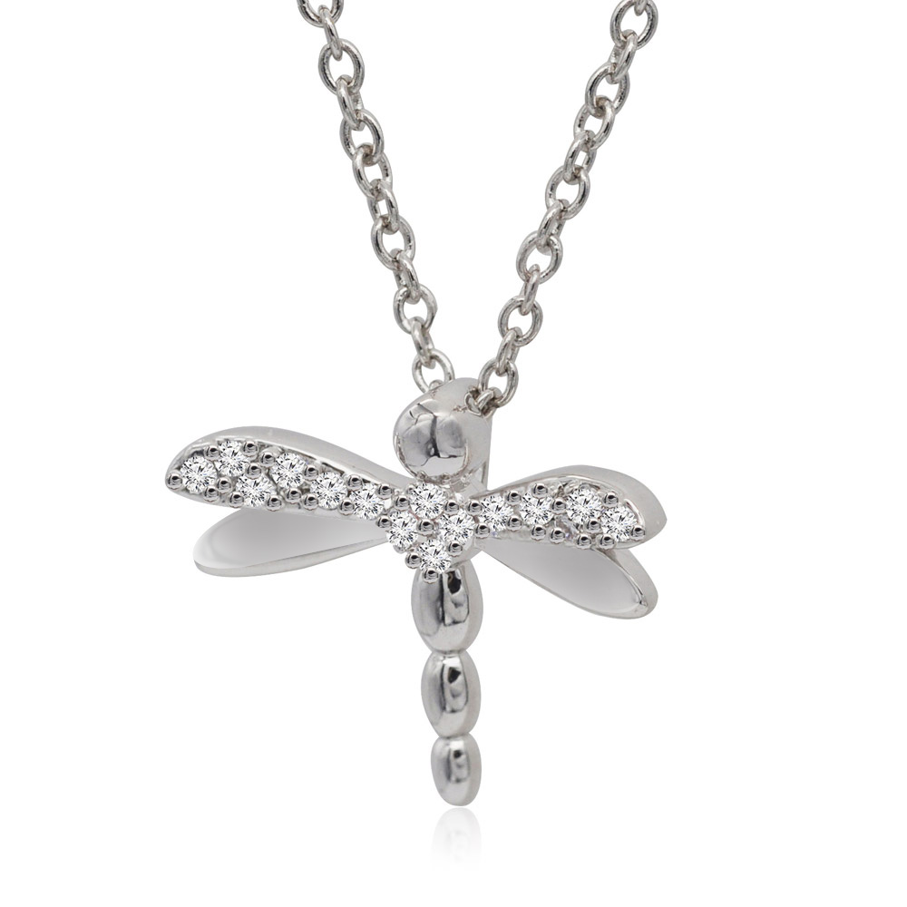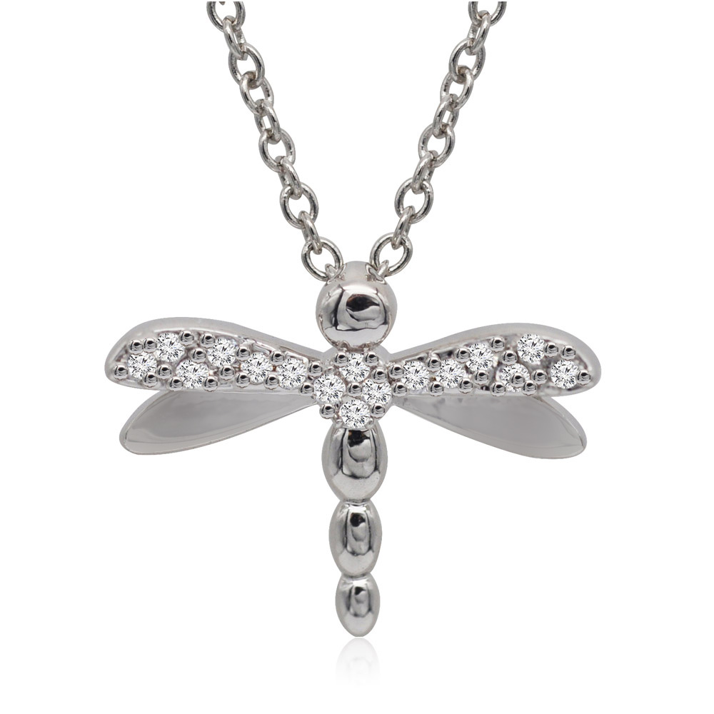 - A detailed view of the silver dragonfly pendant necklace, highlighting the brilliant diamond-like cubic zirconia embellishments.
