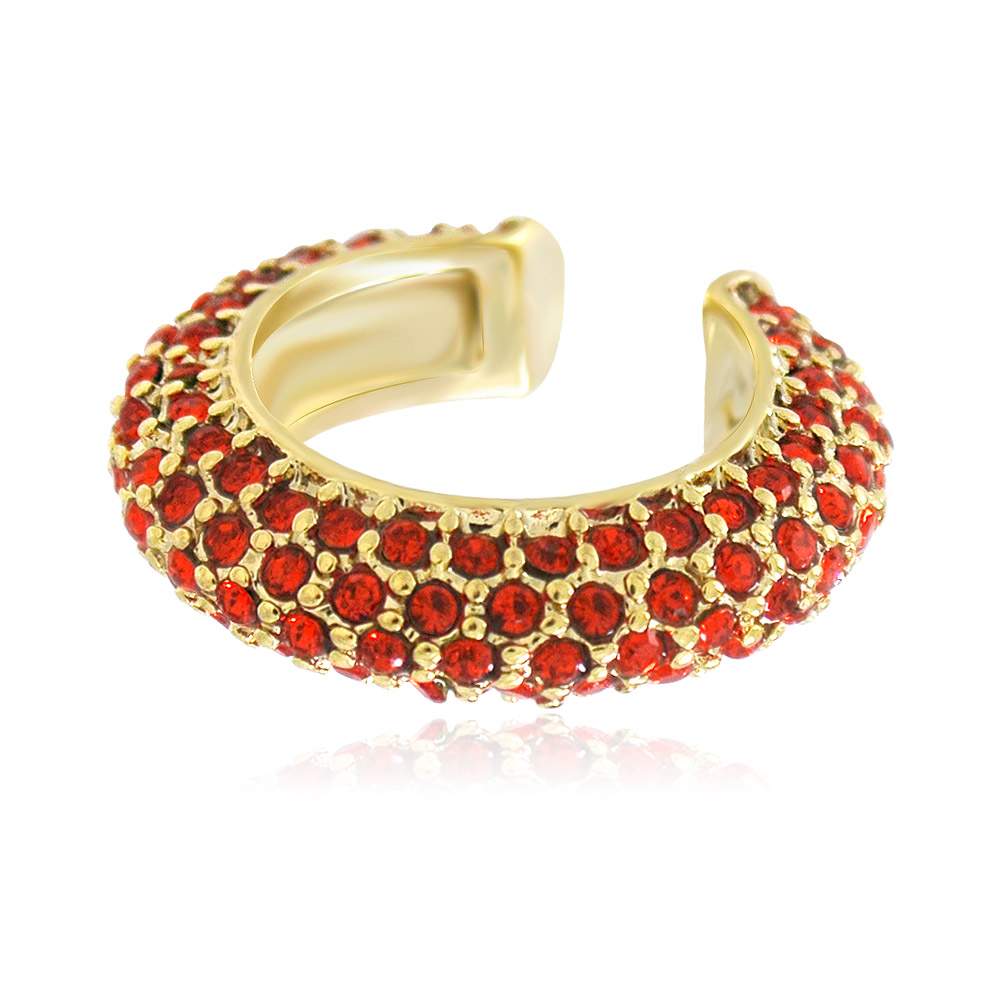 - Close-up of the handmade Real Gold Red Ear Cuff, showing the intricate setting of the cubic zirconia stones.