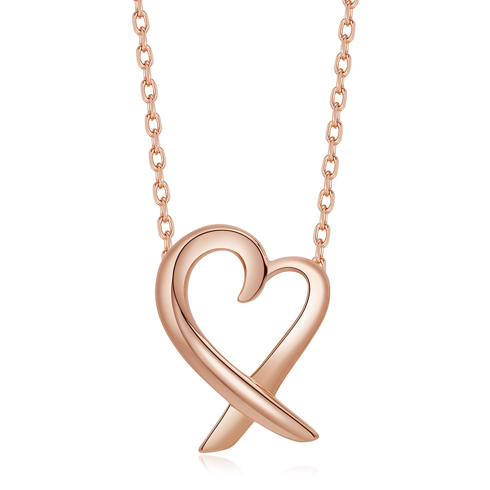 The rose gold heart pendant shown from a different angle, highlighting its unique 'X' design.