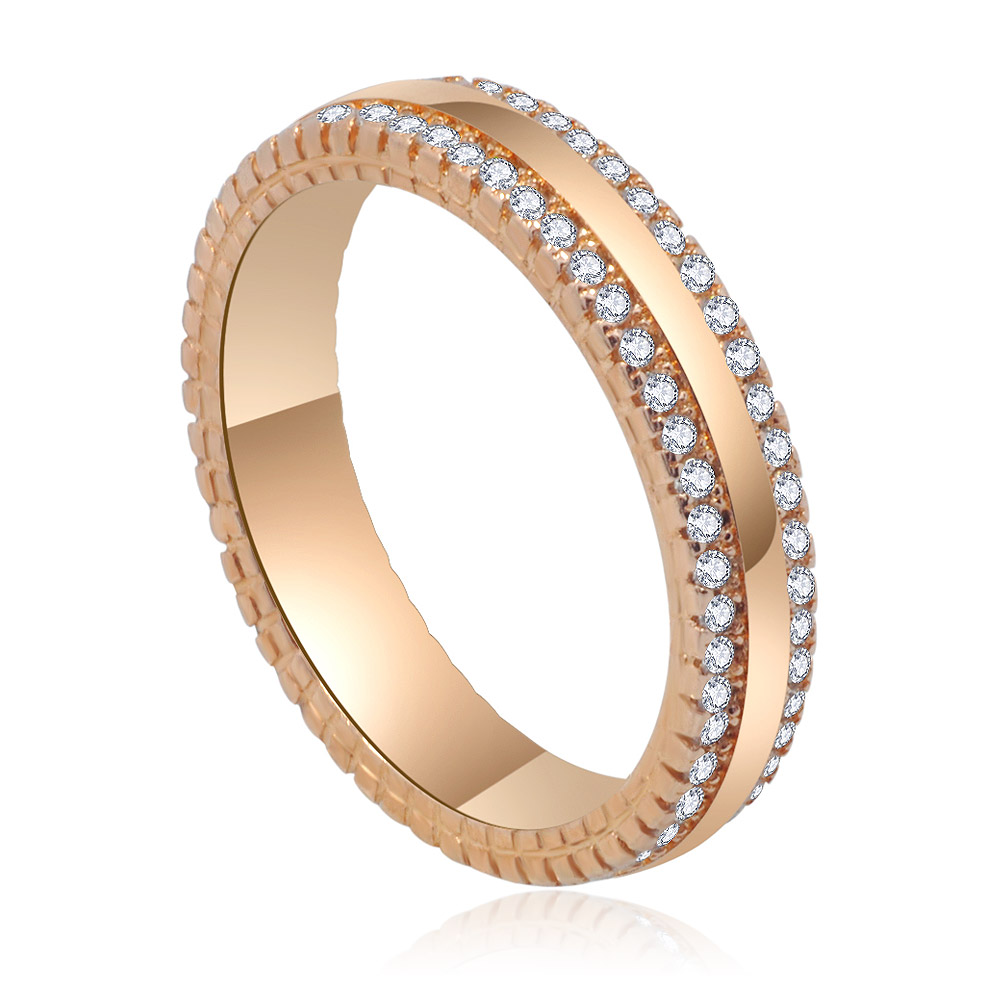- Detailed view of the rose gold wedding band highlighting the intricate cubic zirconia inlays.