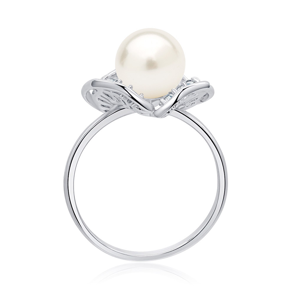 Side view of the Rose Pearl Cocktail Ring, highlighting the baguette-cut cubic zirconia and the large white pearl centerpiece.