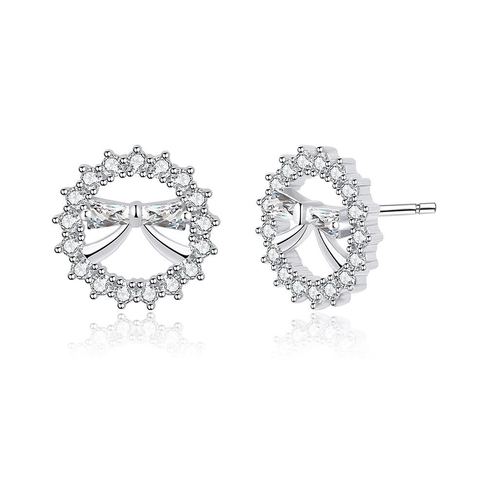 Close-up detail of the Round Mini Bow Stud Earring, highlighting the rhodium-plated finish and the halo of clear cubic zirconia gemstones.