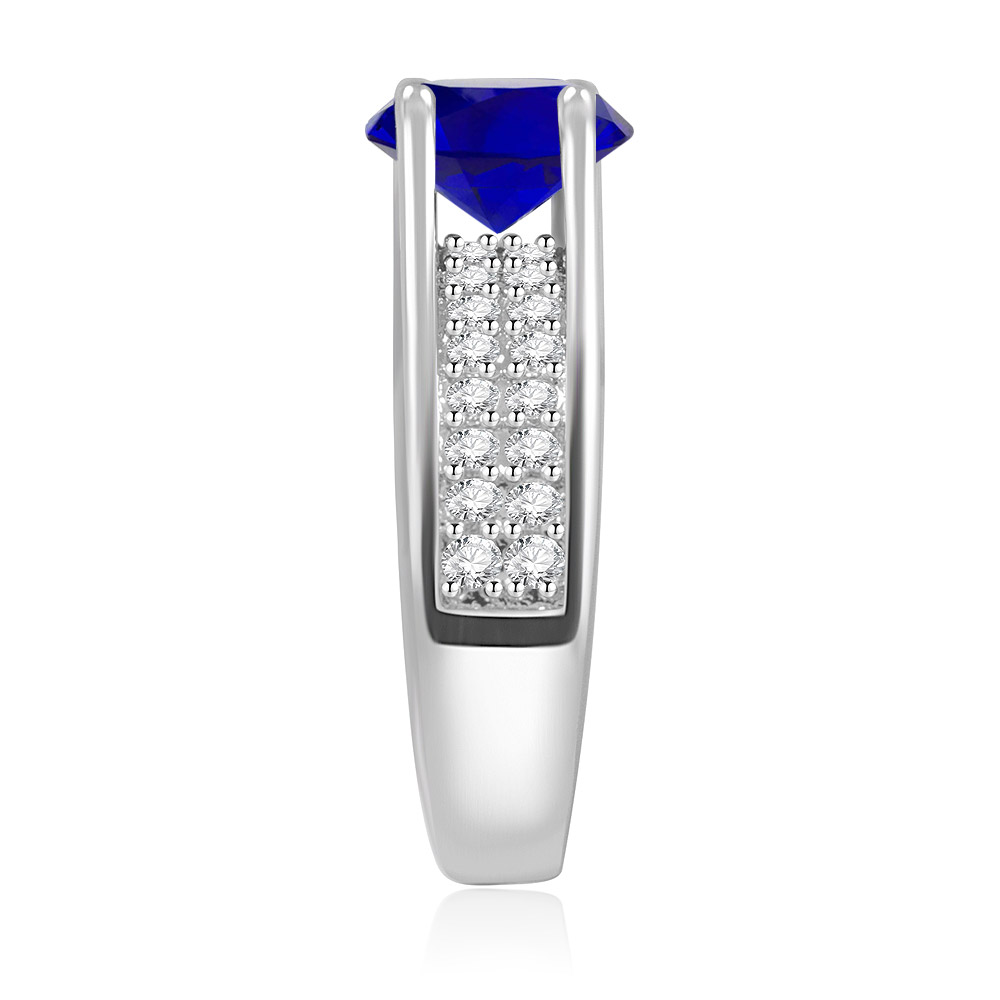 Stand out with this striking Round Sapphire and Zirconia Ring. This beautifully crafted piece is topped with a magnificent Created Sapphire glass stone, capturing the deep, alluring hue of a classic sapphire. The design is further enhanced by a dazzling double row of Zirconia stones meticulously set on the shoulders of the band, adding an extra layer of sparkle and sophistication.