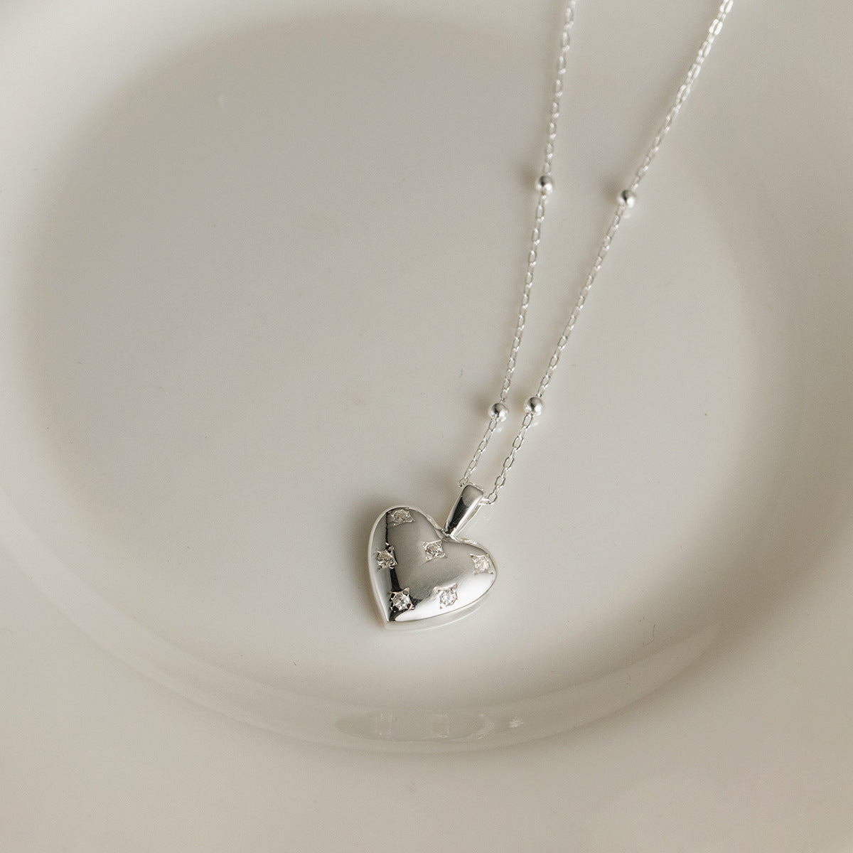 - Close-up of the S925 silver heart pendant necklace showcasing the cubic zirconia details.