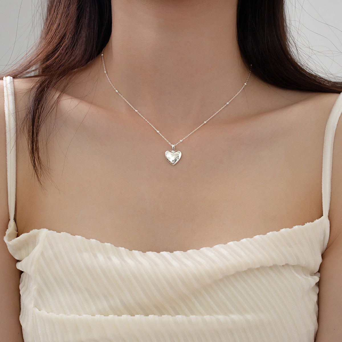 - The elegant silver heart pendant necklace displayed on a neutral background.