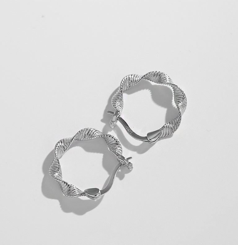 - Detailed shot of the S925 sterling silver textured hoop earrings showcasing the intricate twist.