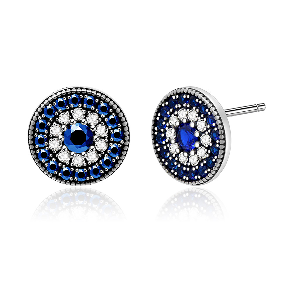 - Close-up of the circular stud earring with a central blue gemstone surrounded by smaller white and blue stones.