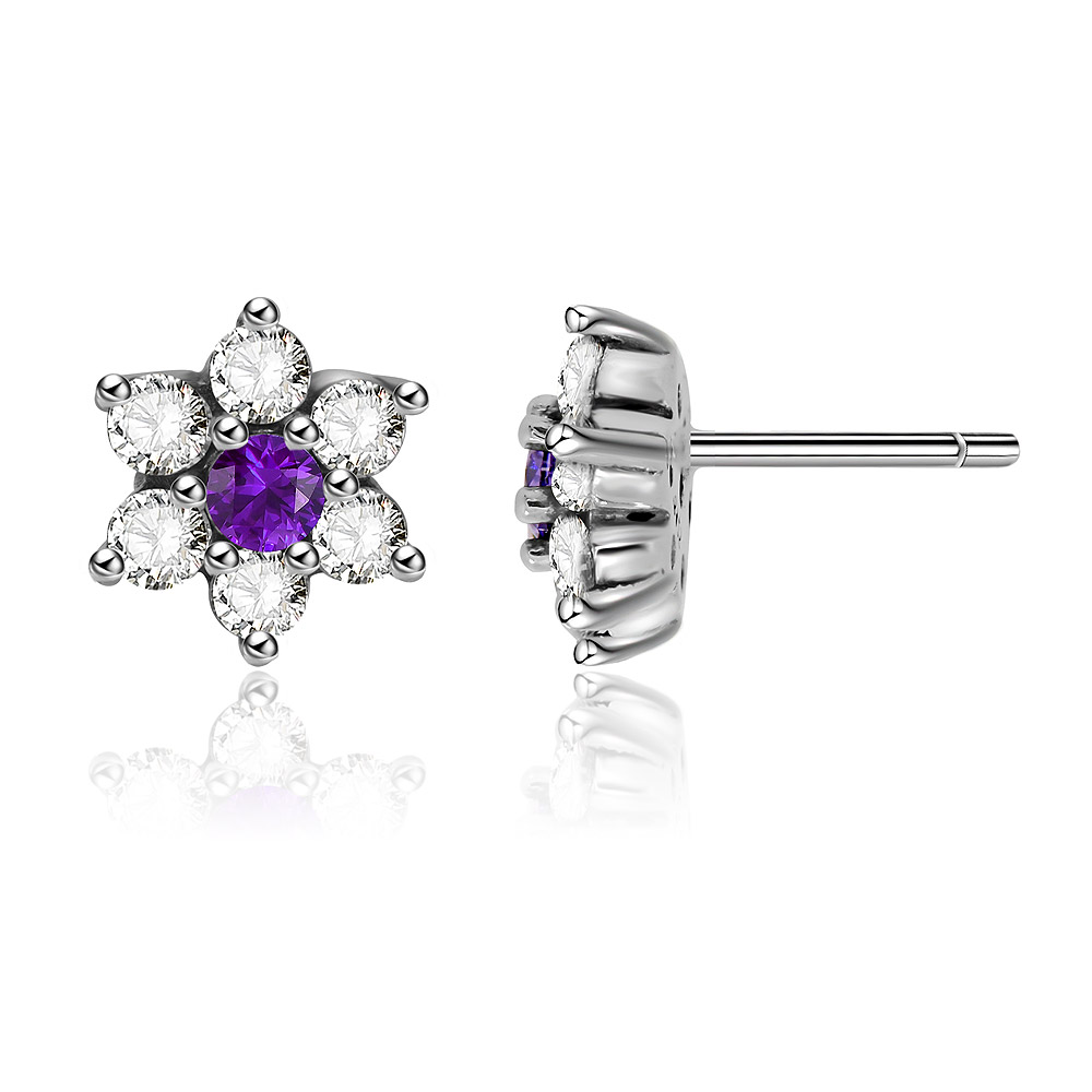 - Detailed view of the flower-shaped silver earrings, highlighting the central purple and surrounding white cubic zirconia gemstones.