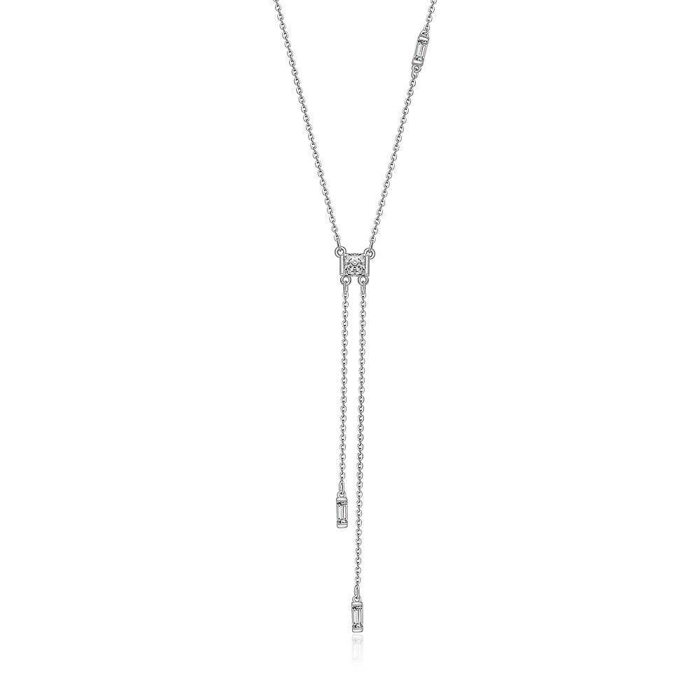 - Close-up of the Y-shaped pendant on the Silver Mini CZ Stone Drop Necklace, showing the dangling cubic zirconia stones.