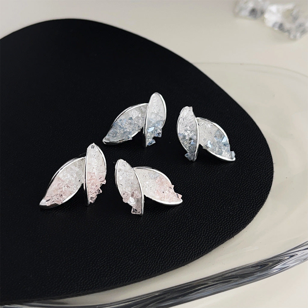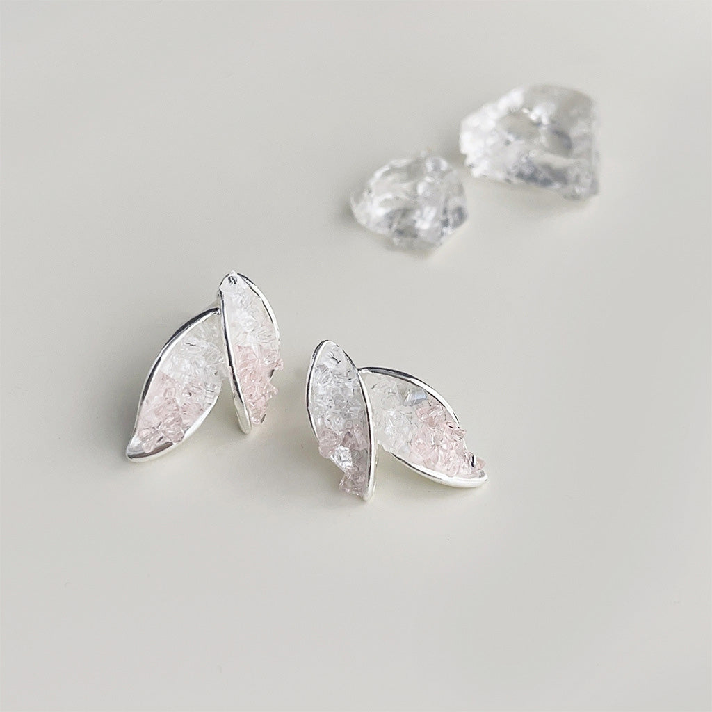 - Detailed view of the silver leaf earrings showing the pale pink and clear crystal texture.