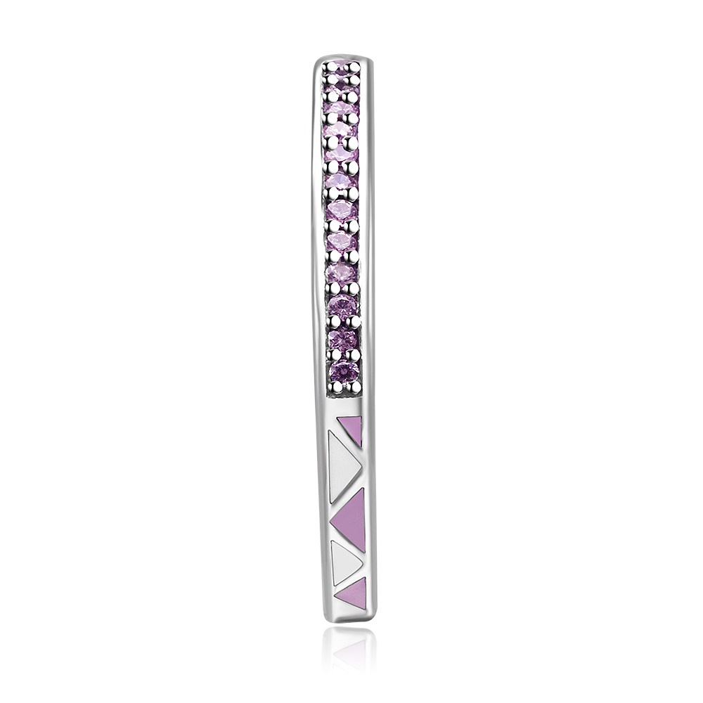- Detailed close-up of the sterling silver eternity band, showing the texture of the light pink epoxy enamel and the setting of the cubic zirconia stones.