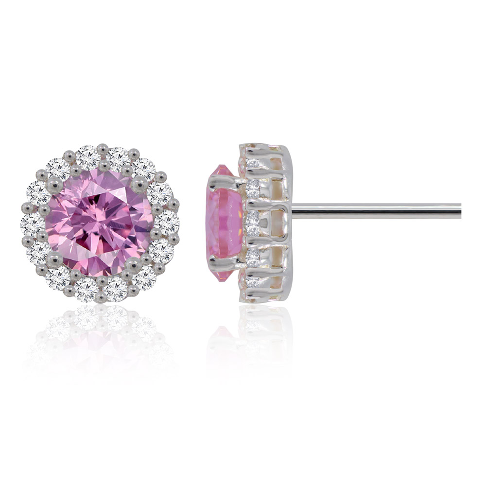 Detailed view of the pink cubic zirconia stud earrings showing the silver setting and crystal halo.