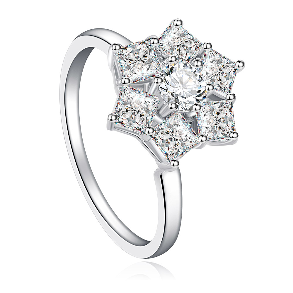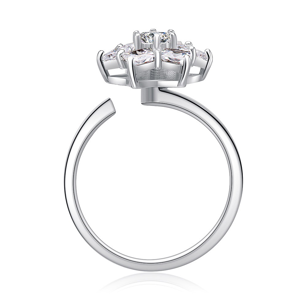- Angled view of the Six Star Cubic Zirconia Spinning Ring, highlighting its unique star-shaped design and brilliant stones.