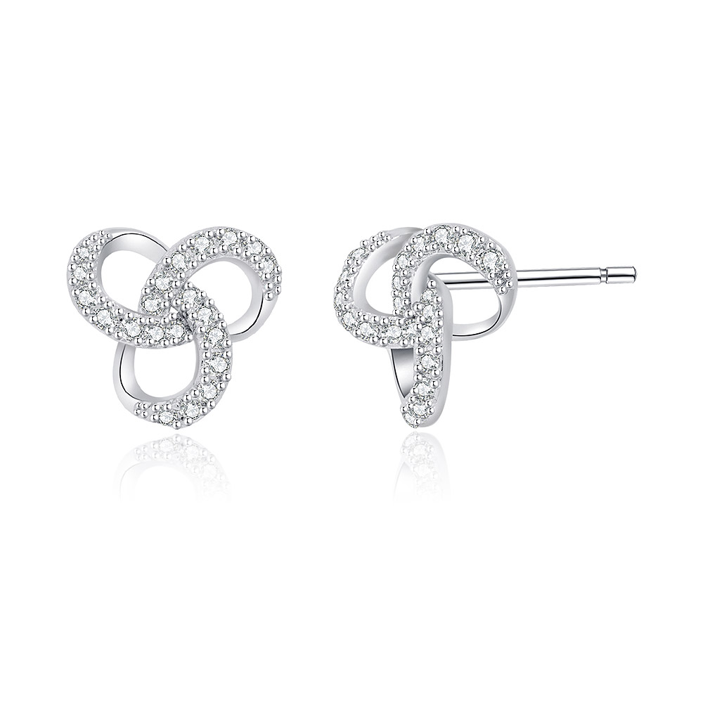 - Detailed front view of the silver love knot stud earring showcasing the intricate twist design and embedded cubic zirconia.