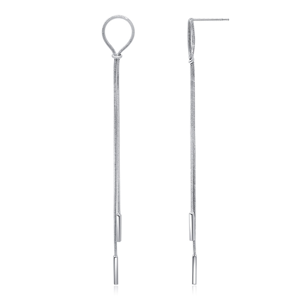 A pair of rhodium-plated snake chain dangling earrings shown from a side angle.