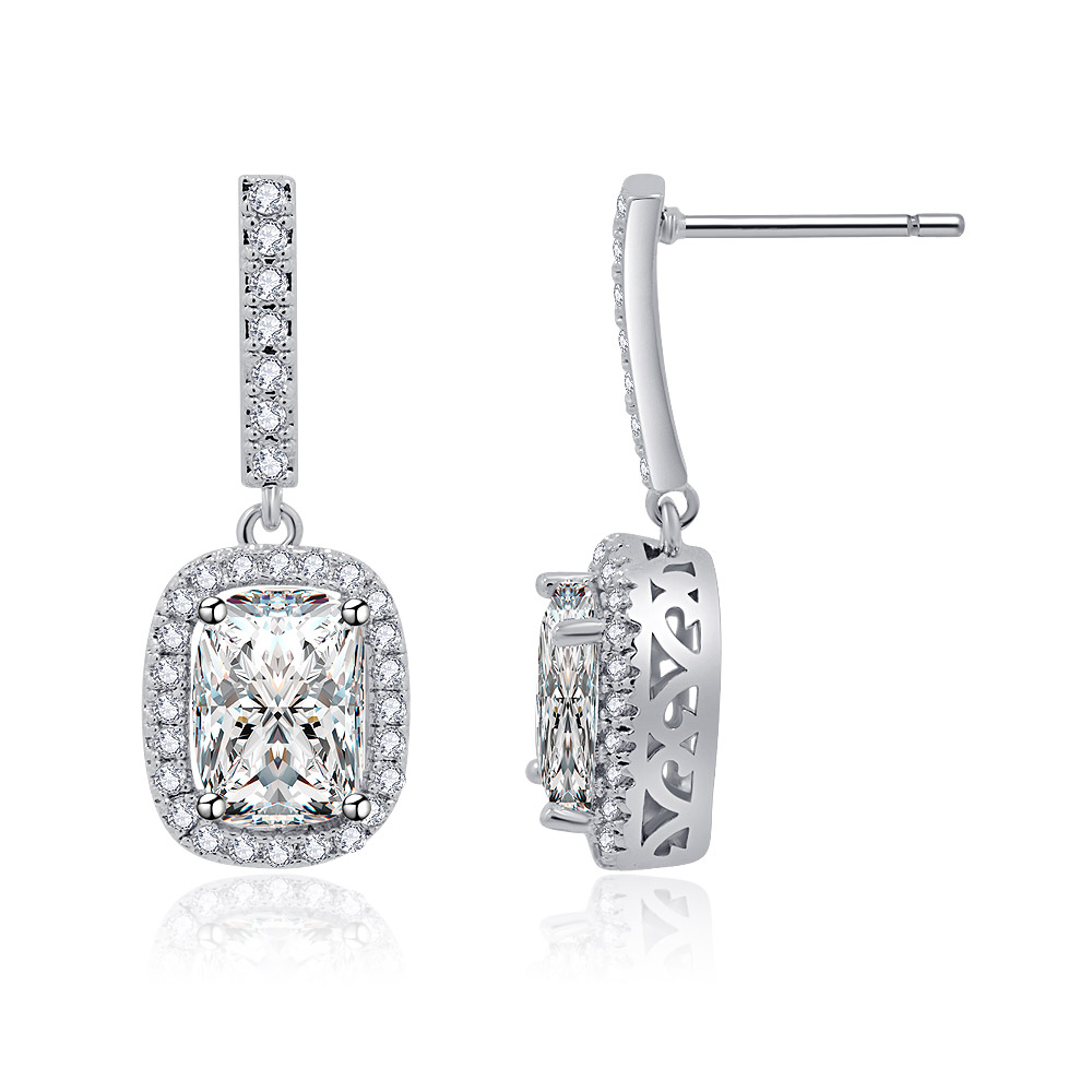 - Angled shot of the silver dangle earrings, highlighting the brilliant emerald-cut CZ and surrounding halo of smaller stones.
